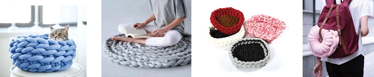 It's used for making pet cotes, carpets, blankets, cushions, and vases, so mostly the 2cm jersey chunky yarn is used to keep the finished products tight in shape.