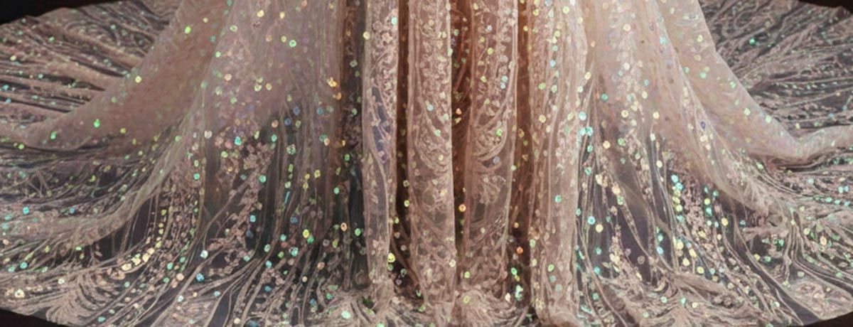 Clear sequin fabric features transparent or iridescent sequins stitched onto a fine mesh, often a transparent beige lace. This construction creates a floating effect, where the sequins appear to shimmer on their own.