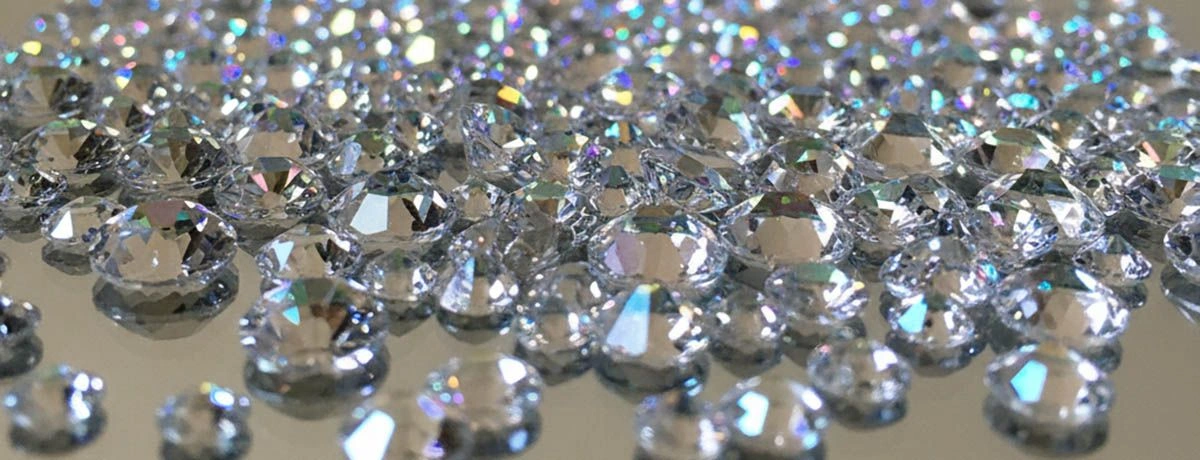Manufacturers produce glass rhinestones using faceted glass tops and reflective backing materials. Glass rhinestones are made from genuine glass and are cut and polished by special machines to ensure utmost sparkle. This construction maximizes sparkle and light dispersion, creating a brilliant finish that significantly outperforms acrylic or resin alternatives. The flat side of glass rhinestones is mirrored, which provides for easy placement and enhances clarity and light refraction.
