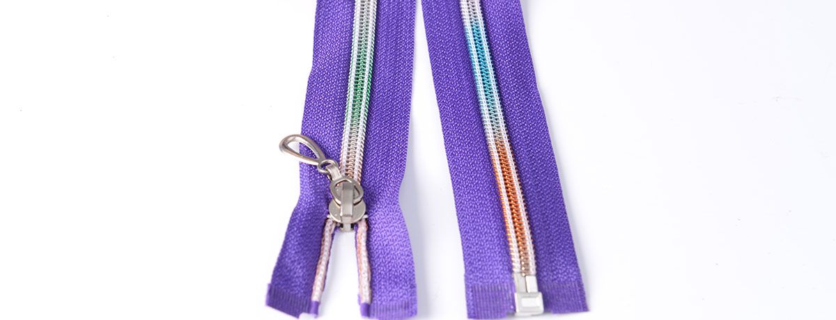 Metal rainbow zips: Metal teeth (typically brass or zinc alloy) with rainbow electroplated finish using PVD technology to create an iridescent titanium effect. Used on premium denim jeans, leather jackets, and fashion handbags where a high-end look justifies the higher cost. These hold up well to repeated wear and offer superior weight and tactile quality.