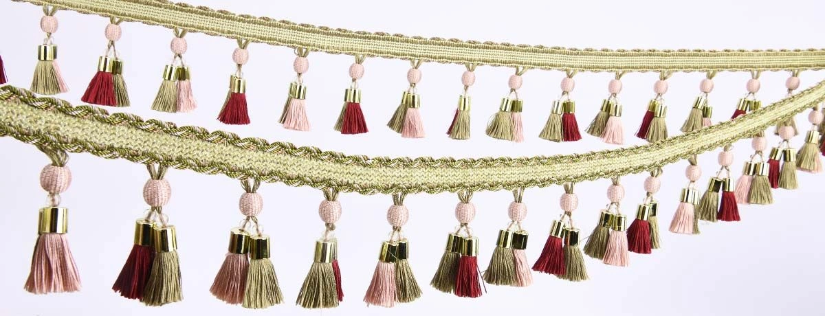 Tassel fringe combines the hanging elements of standard fringe with decorative ornamental heads. These trims are constructed using threads, beads, or rhinestones and are widely used to finish the edges of heavy fabrics, such as curtains, valances, and decorative throws. White tassel fringe is a popular option for embellishing evening gowns, dance costumes, and home décor, thanks to its intricate beadwork and ease of application. Pink tassel fringe offers a vibrant and decorative choice for fashion or craft applications. Tassel fringe is available for purchase by the yard or spool, providing flexibility for different project sizes. The complexity of tassel fringe requires precise manufacturing to ensure uniformity across large volume orders.
