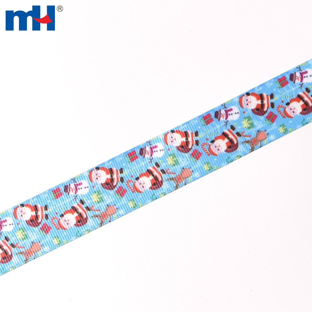 1" Grosgrain ribbon printed with a cheerful Christmas design perfect for hair bows, Christmas wreaths, gift wrapping, sewing and crafts.