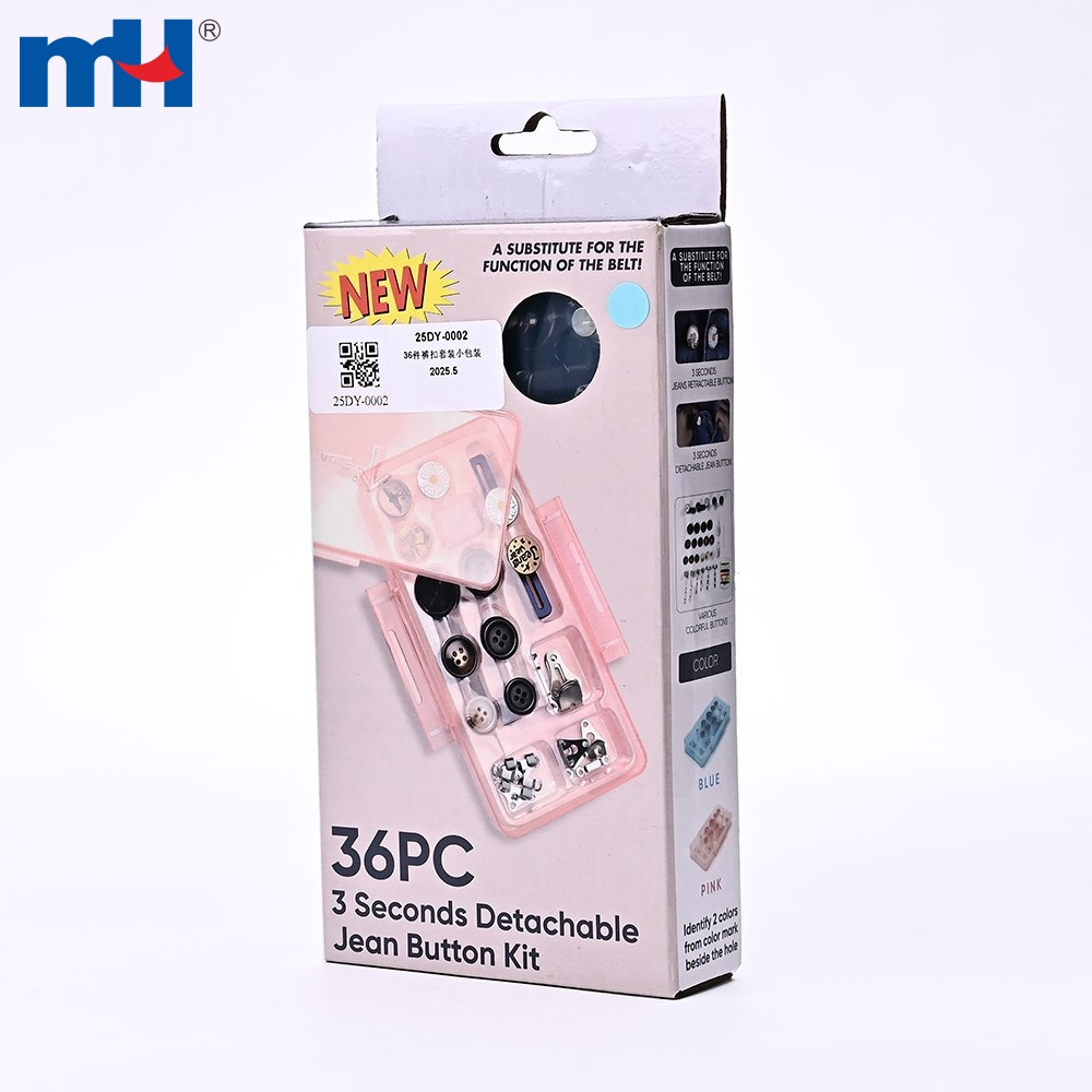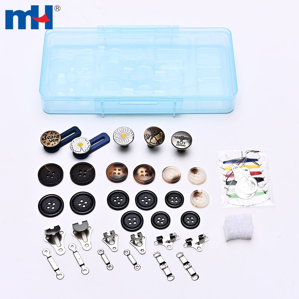 This 36-piece pants button repair kit is designed for quick and easy fixing of trousers, jeans, skirts, and other garments. Packed in a compact transparent box, it offers essential tools for replacing buttons, adjusting waist size, and performing simple sewing repairs anytime.