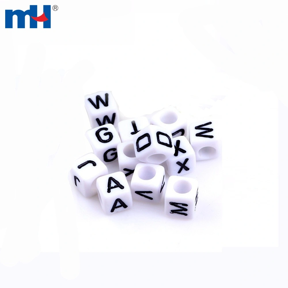 White beads with black letters