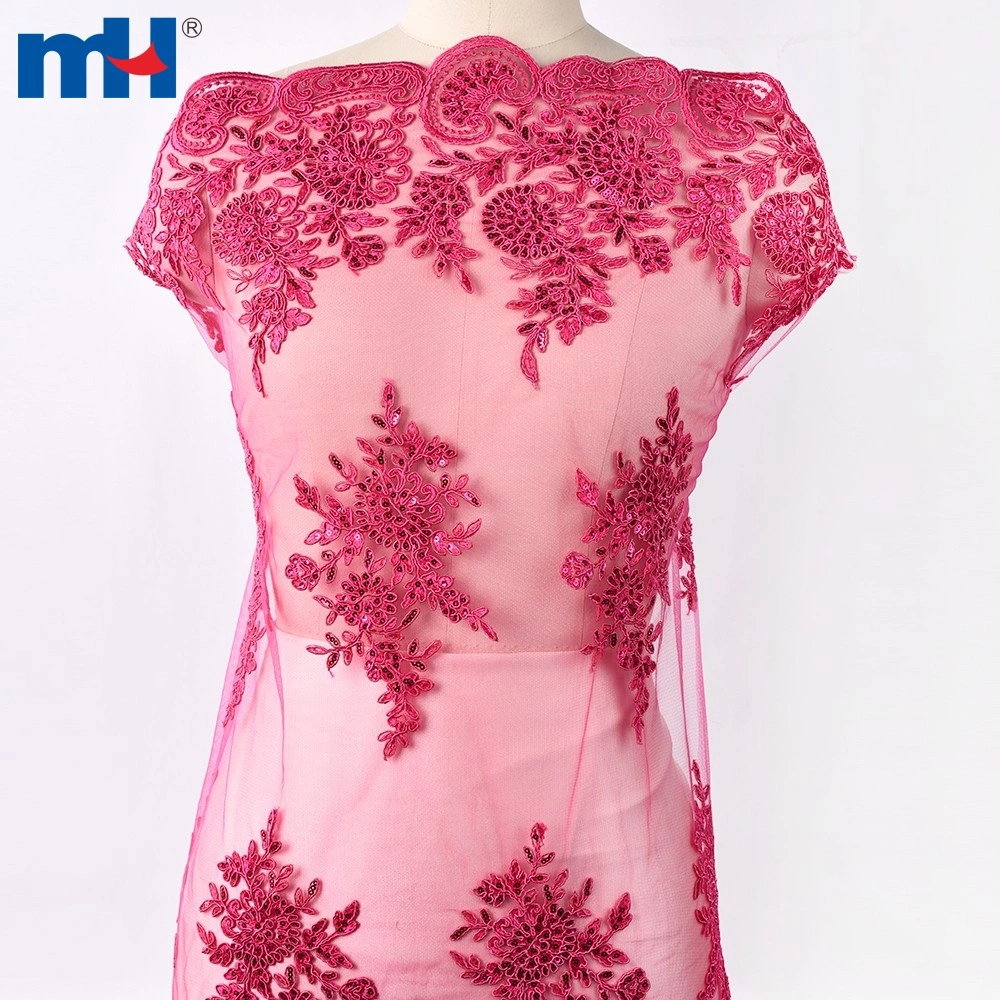 Fuchsia floral lace with sequins, on a nylon mesh, with detailed scalloped borders on both sides.