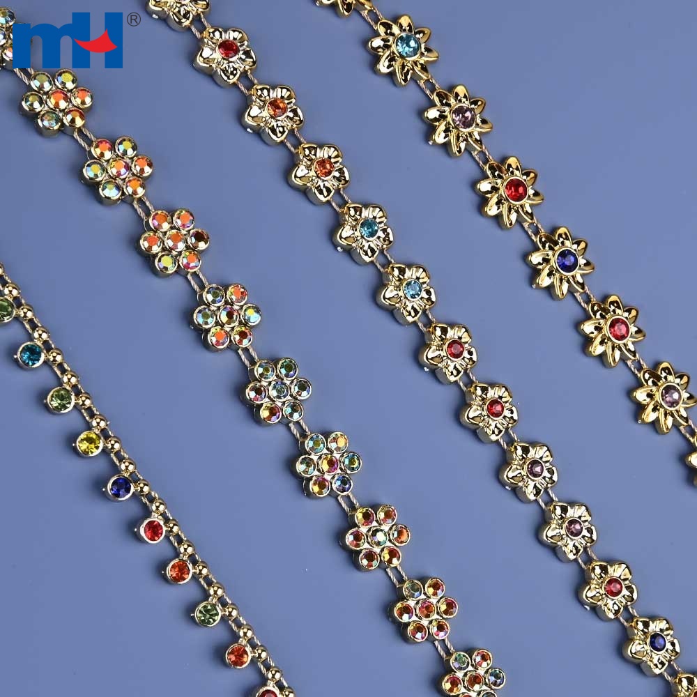 The shiny, multi-faceted rhinestones, inlaid on golden plastic chains, add more beauty to the chains.