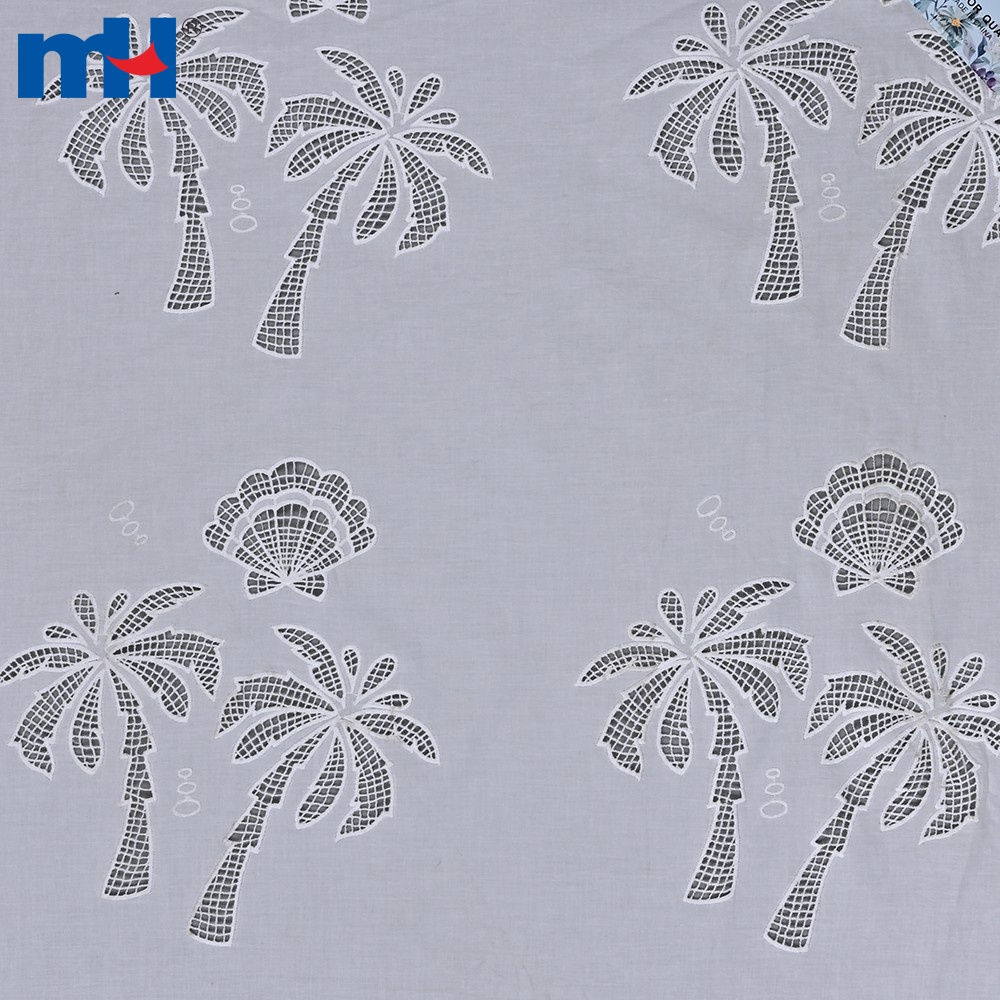 The design prominently includes stylized palm trees. The palm fronds are depicted with a combination of solid and openwork embroidery, creating a lace-like effect within the leaves.