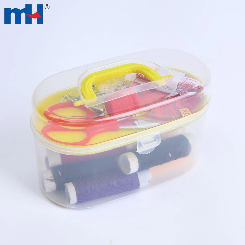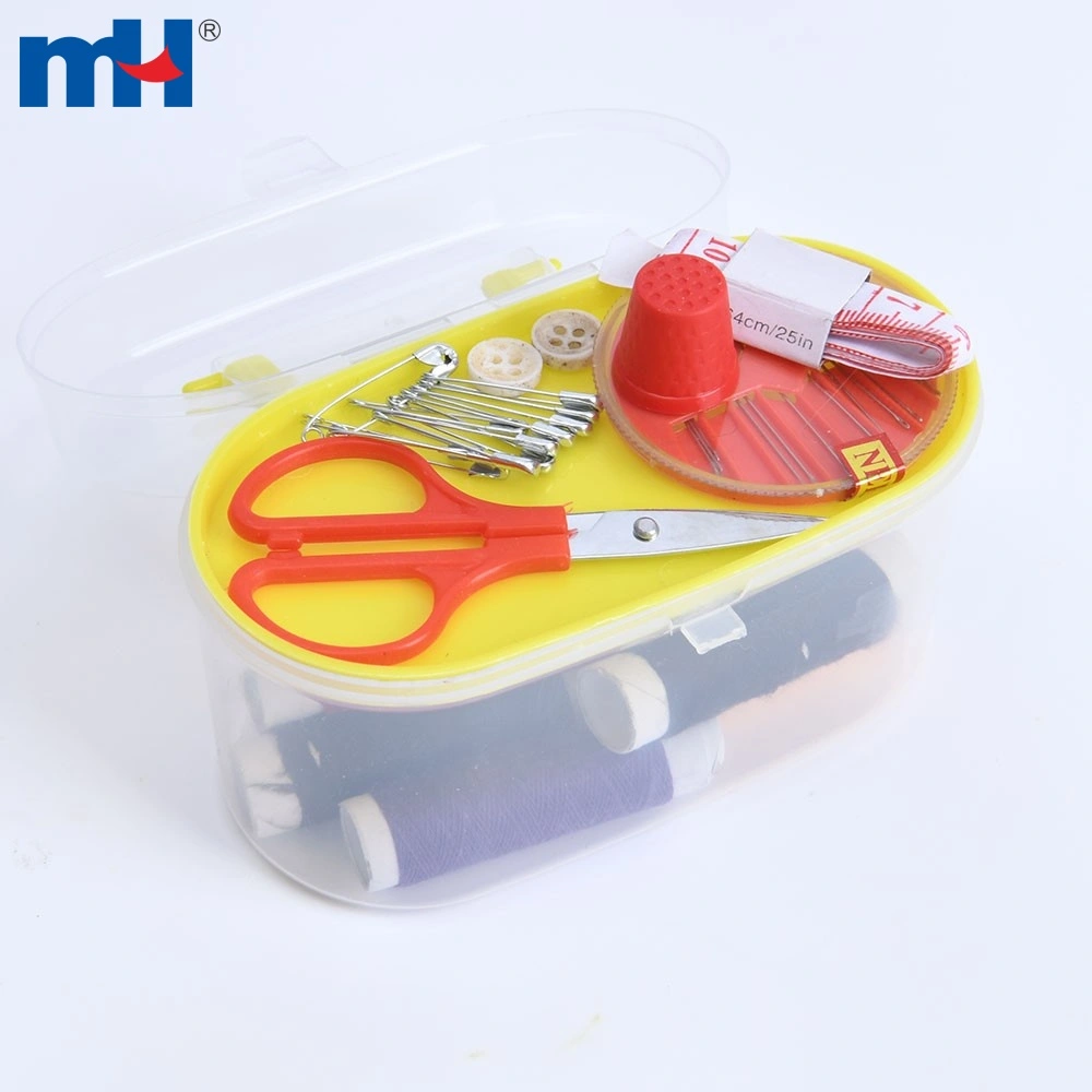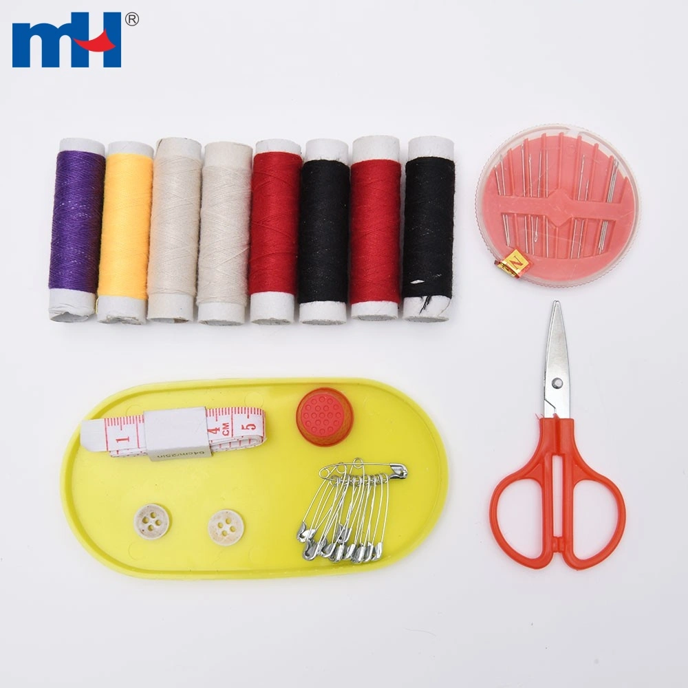 Package: 23pcs/set, including 8pcs polyester thread(8 rolls), 1pc needle box, 1pc 25 inch tape measure, 10pcs safety pin, 1pc thimble, 1pc button, 1pc scissor.
