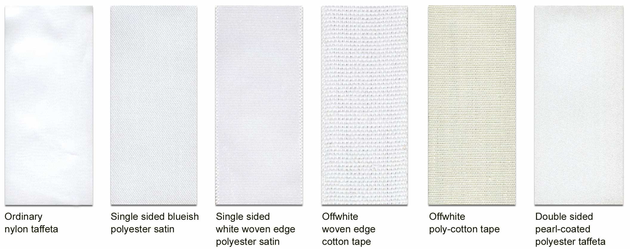 MH garment label materials, including nylon taffeta, polyester satin, cotton tape, poly-cotton tape, and coated polyester types.