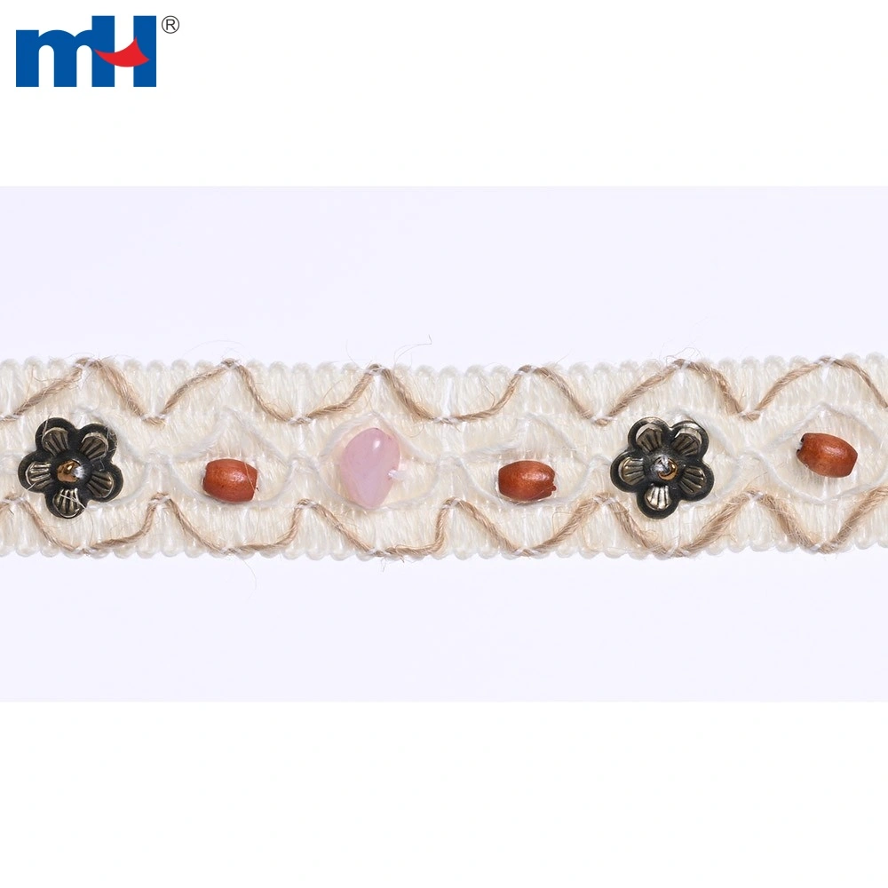Shell fringe trim is a type of decorative trim made by attaching shells (natural or artificial) to a base material, often combined with fringe elements like threads, cords, or fabric strips. The shells are typically arranged in a repeating pattern along the trim, creating a visually striking and tactile design. This trim is both functional and ornamental, adding texture and movement to various items.