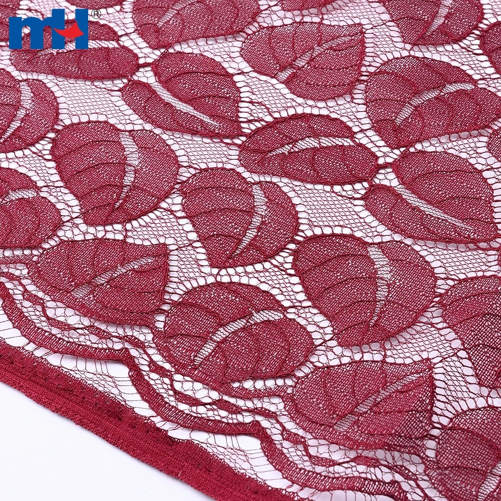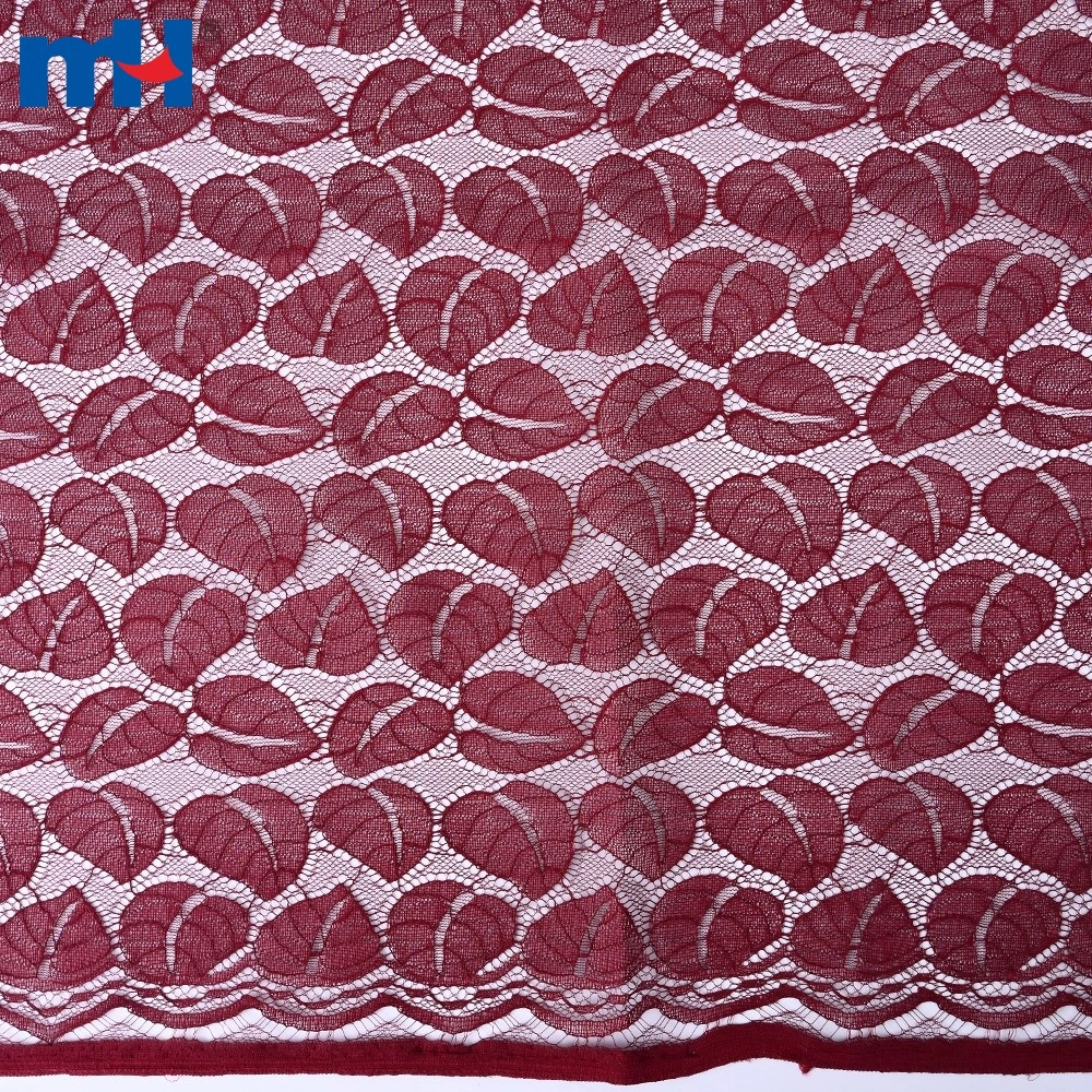 Tricot lace fabric with an elegant leaf-shaped design. The pattern features densely arranged heart-shaped leaves, outlined with smooth veins and supported by a fine mesh base. The rich wine-red color enhances its noble and romantic appeal, making it a versatile decorative fabric.